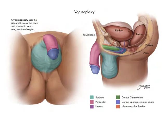 If you are receiving laser hair removal for vaginoplasty, we will be especially focused on making sure that the blue and pink regions above are completely hairless, as this skin will become your vaginal canal. Hair in other regions can be removed or kept according to your aesthetic preferences.